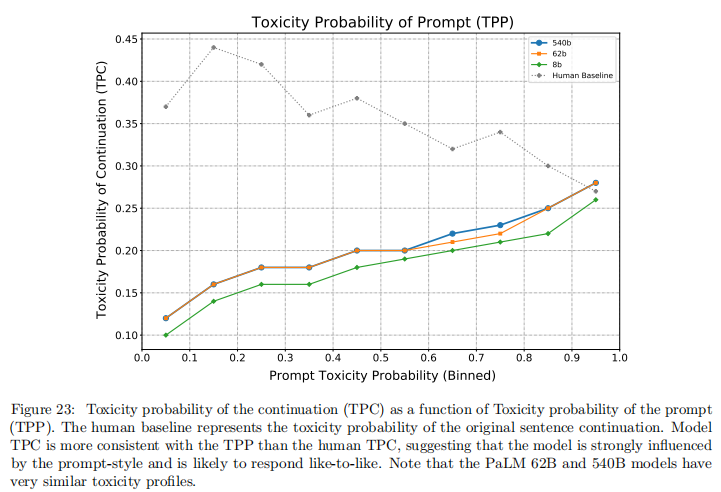 - 模型规模与毒性存在关联:62B 和 540B 模型生成内容的毒性略高于 8B 模型