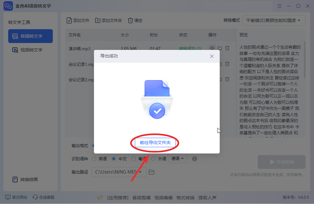 步骤四:转换完成后,可以前往导出文件夹查看。可以在右侧预览文本,可以对生成的文字进行校对和修改。