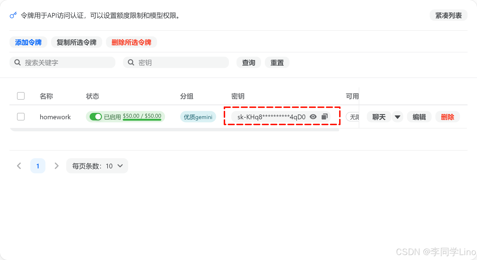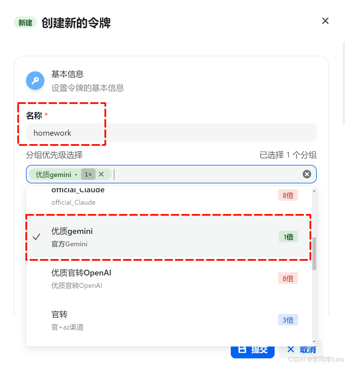 这里的名称随便填写,比如我填写:homework,然后在分组中选择“优质gemini”,这个是中转了Google的Gemini,可以直接使用的。