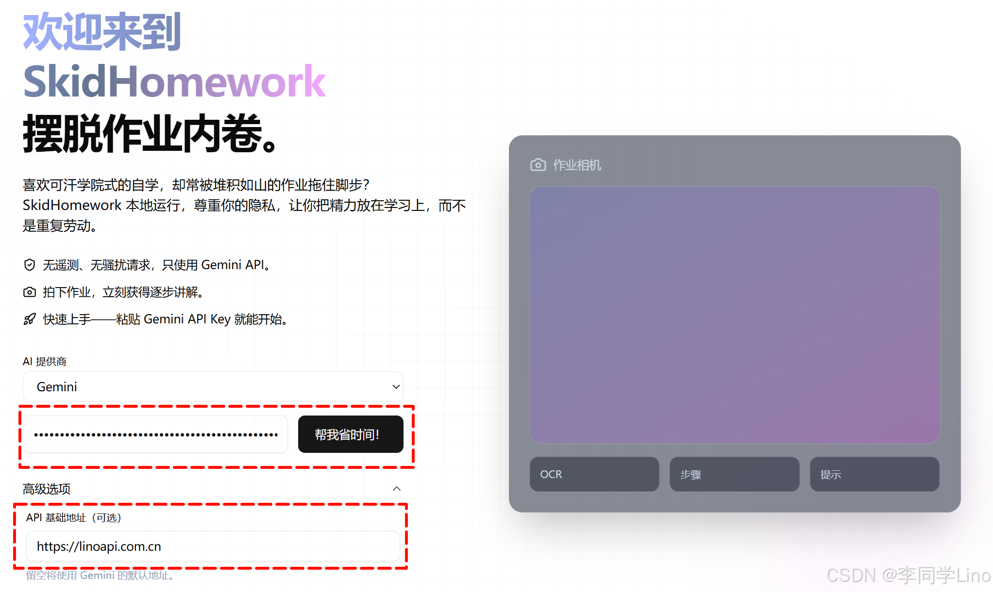 然后来到本地部署的网站(http://localhost:5173/),粘贴刚刚复制的APIKey,点击那个“高级选项”,输入API基础地址: https://linoapi.com.cn,然后点击【帮我省时间】进入到项目主页。