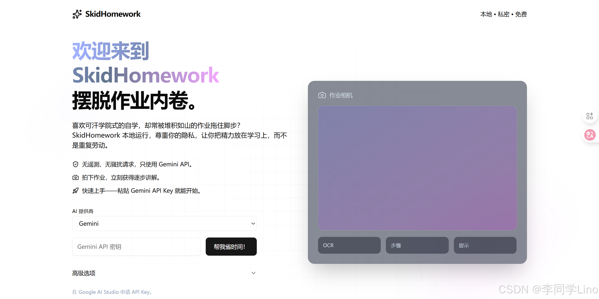 这次,我准备手把手带你把 skid-homework(打滑作业)—— 一个能通过拍照或输入题目,让 AI 自动解题、给出解析的开源项目——从零部署到你的 Win11 电脑 上。