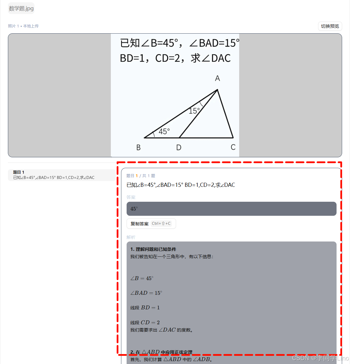 然后点击“开始打滑”,AI就可以通过OCR 识别题目,进行推理,生成结果,展示答案了。