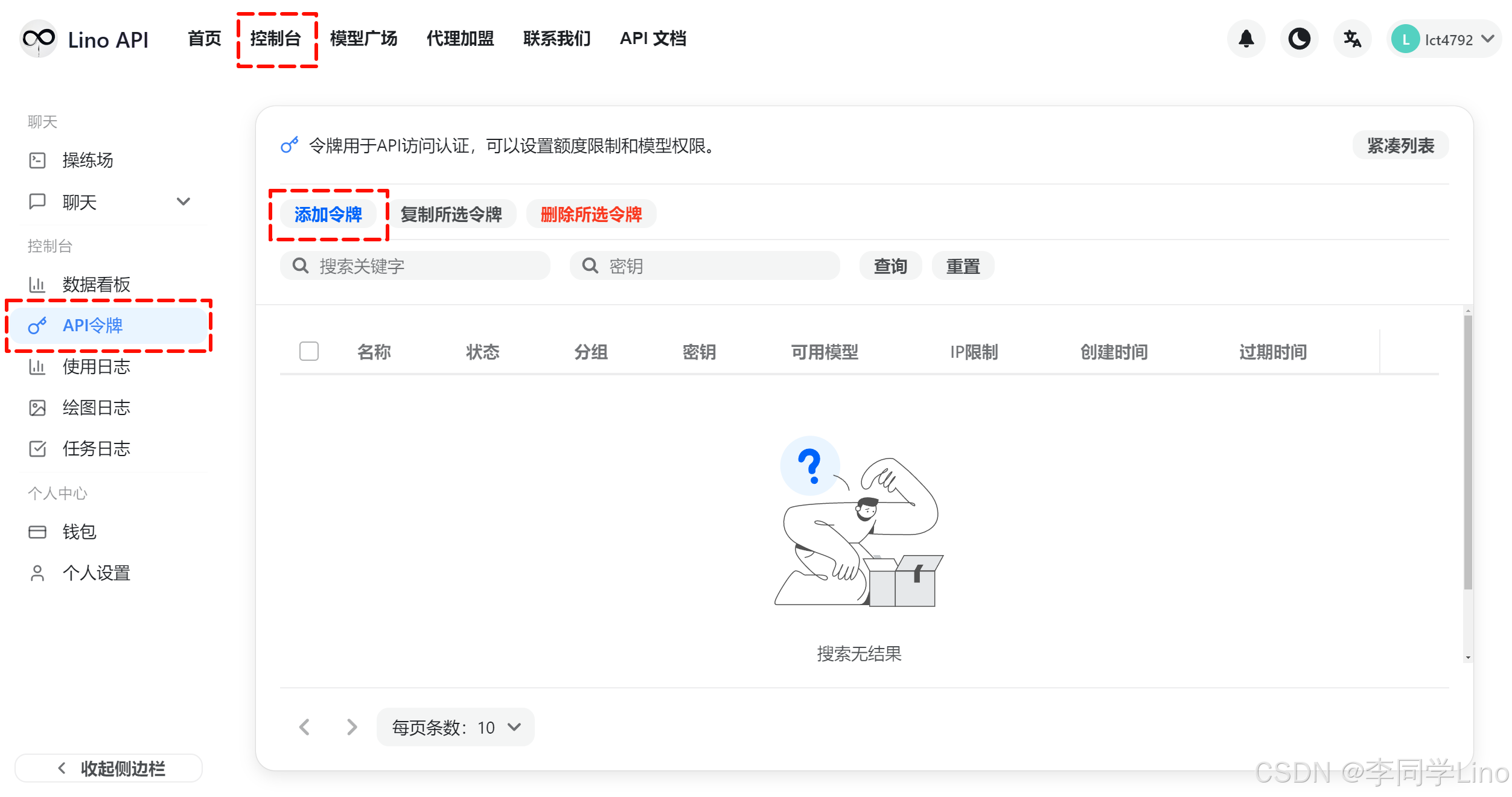 注册或登录账号后,进入顶部导航栏的 「控制台」,在左侧菜单中找到 「API 令牌」,然后点击 「添加令牌」 即可生成你的专属 API Key。