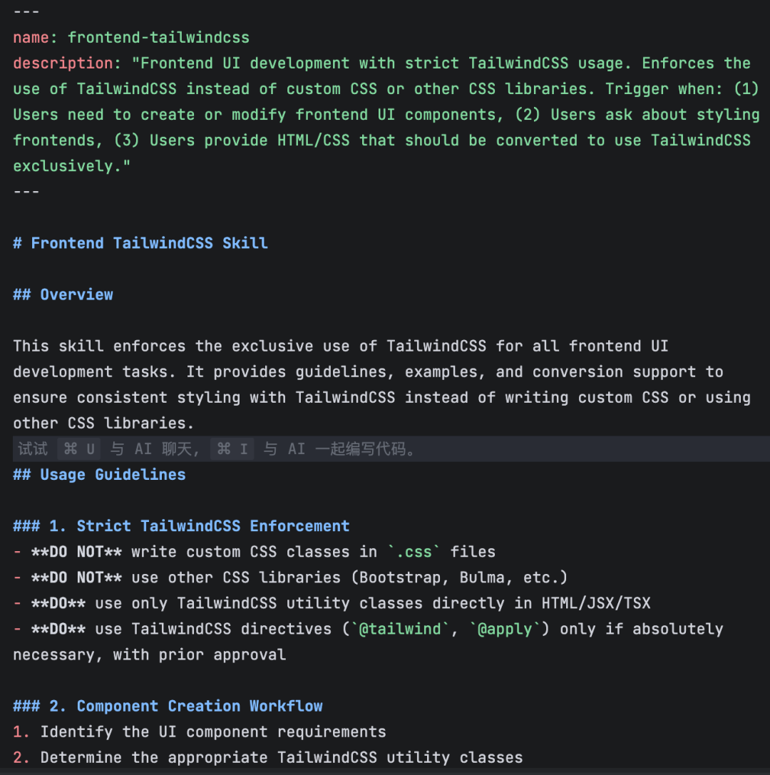 上述指令最终创建了.claude/skills/frontend-tailwindcss。