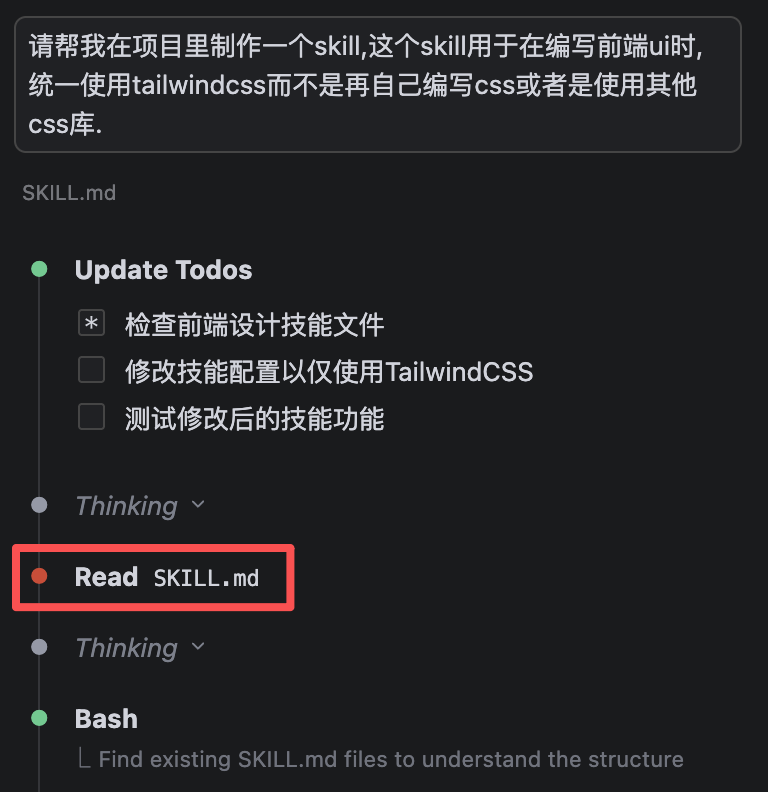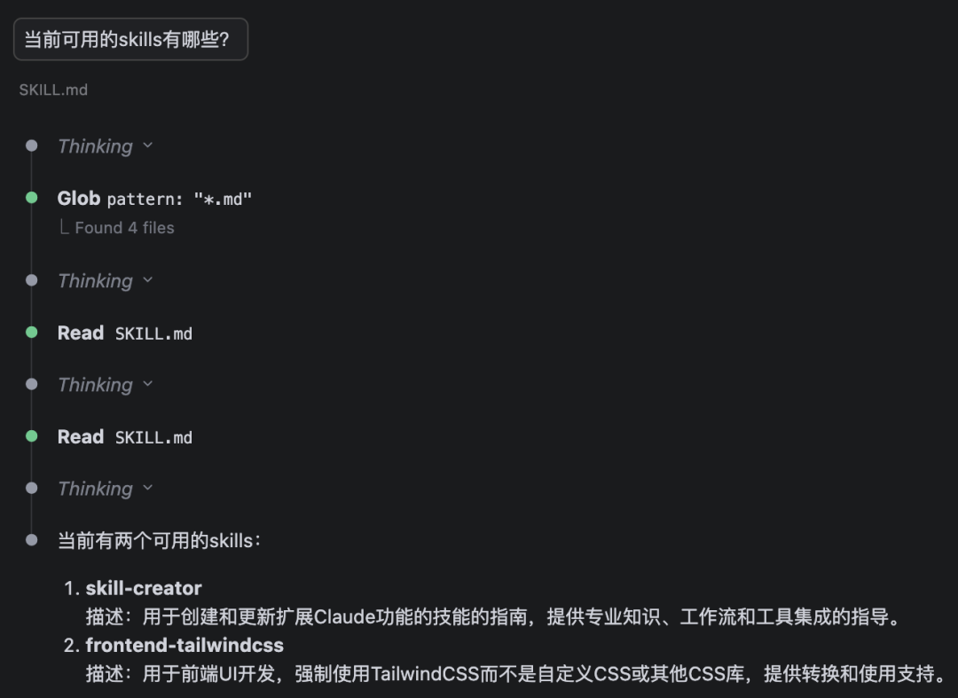 (不得不说,这个提示确实很弱。。很多时候我也不知道agent是否真的在用skill,希望以后可以更新更明显一些)