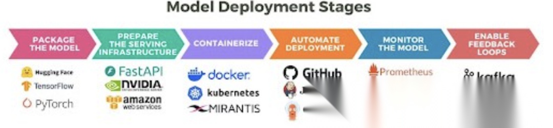 - 模型打包 → 2. 准备服务基础设施 → 3. 容器化处理 → 4. 自动化部署 → 5. 模型监控 → 6. 建立反馈循环 (涉及工具:Hugging Face、FastAPI、Docker、GitHub、Kubernetes、Jenkins、Prometheus、Grafana、TensorFlow、PyTorch、NVIDIA、Kafka、Amazon Web Services、Mirantis、Argo、Splunk、Airflow)