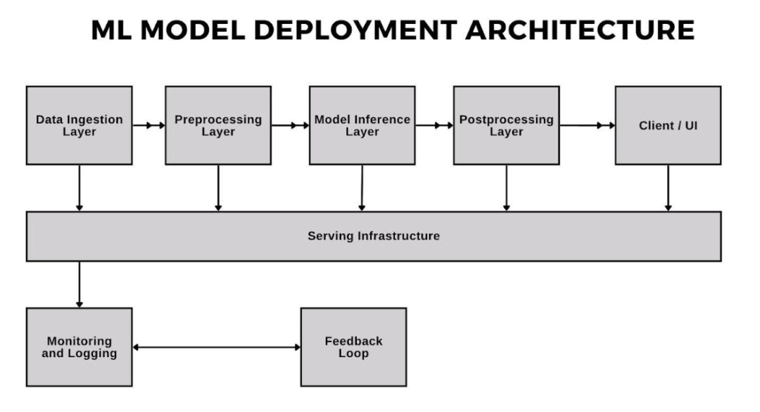 成功的机器学习部署依赖精心设计的架构——将数据源、模型服务、基础设施及监控整合为一个协调运转的系统。机器学习模型部署架构包含多个组件,这些组件需可靠协作才能确保整体系统正常运行。