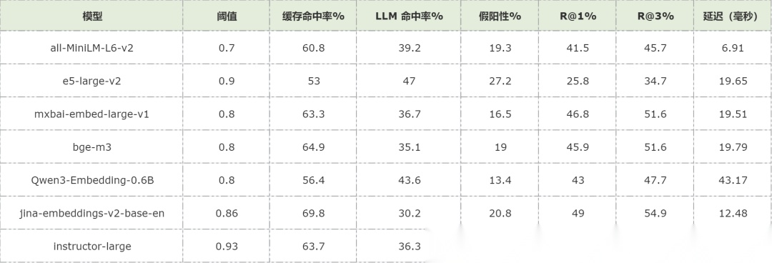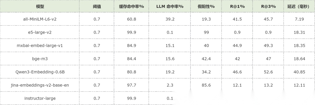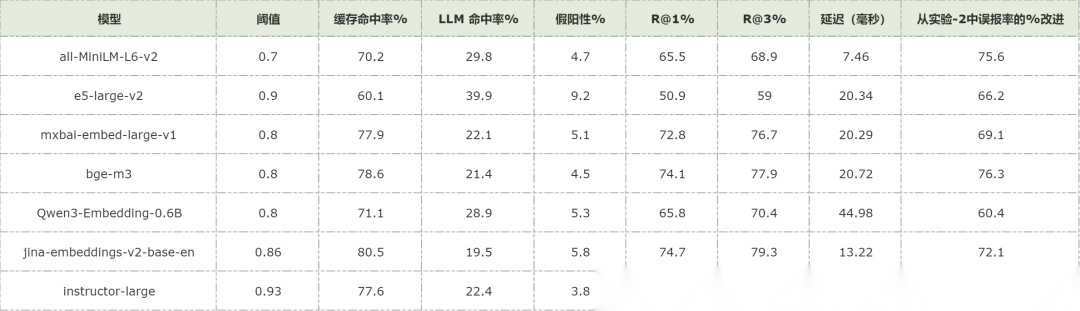 - 测量指标:缓存命中率 %、LLM 命中率 %、FP%(假阳性率)、Recall@1、Recall@3 和延迟
