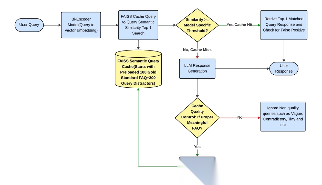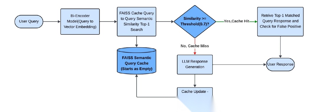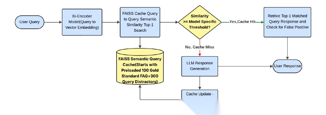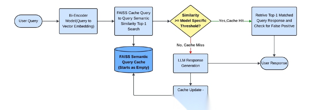 我们的测试系统使用了查询到查询的语义缓存架构。用户查询被向量化,并与基于 Facebook AI 相似性搜索(FAISS)的先前回答查询的缓存匹配。如果在设置的相似度阈值之上找到类似的查询,则从缓存返回相应的金答案。如果查询没有达到阈值,系统会退回到大语言模型(LLM)来生成响应,然后将响应添加到缓存中以供将来使用。。评估环境旨在紧密镜像生产规模和行为,维护相同的缓存逻辑、模型配置和性能参数,以确保真实和可重复的结果。图 1 说明了高级语义缓存架构。