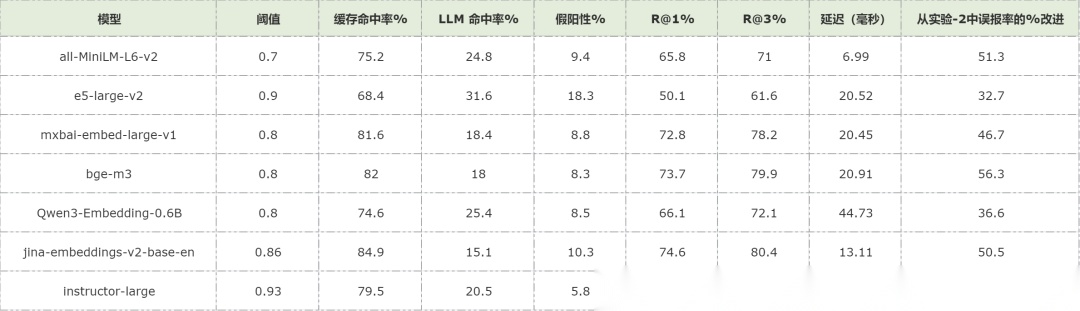 下面的表格总结了所有模型的零样本基线结果。每个模型都使用空缓存和固定的 0.7 相似度阈值进行了测试。指标包括缓存命中率、LLM 回退率、假阳性、召回率和延迟,在进行任何缓存优化之前建立一个明确的参考点,并说明后来的架构改进如何减少生产中的假阳性。