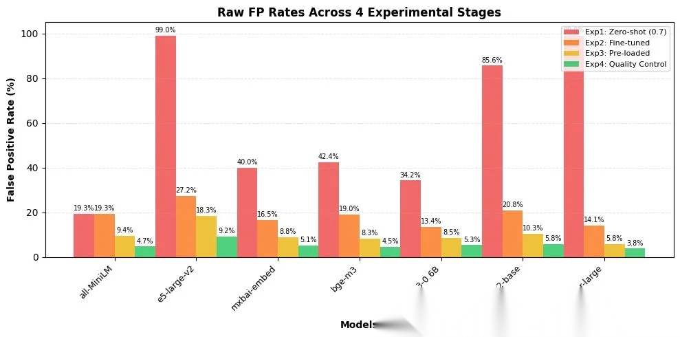 我们的第一个实验建立了一个零样本基线,揭示了一个重要的“假阳性危机”。使用空缓存和默认阈值时,模型的表现令人无法接受,其中两个模型达到了 99% 的高假阳性率,这意味着几乎每次缓存命中都是不正确的。在这个阶段,即使是表现最好的也有 19.3% 的答案是错误的。这表明,在没有领域上下文的情况下对一般语义相似性进行优化的零样本模型不适合像银行这样的领域,因为它们基于表面级别的语言相似性而不是必要的功能意图来匹配查询。