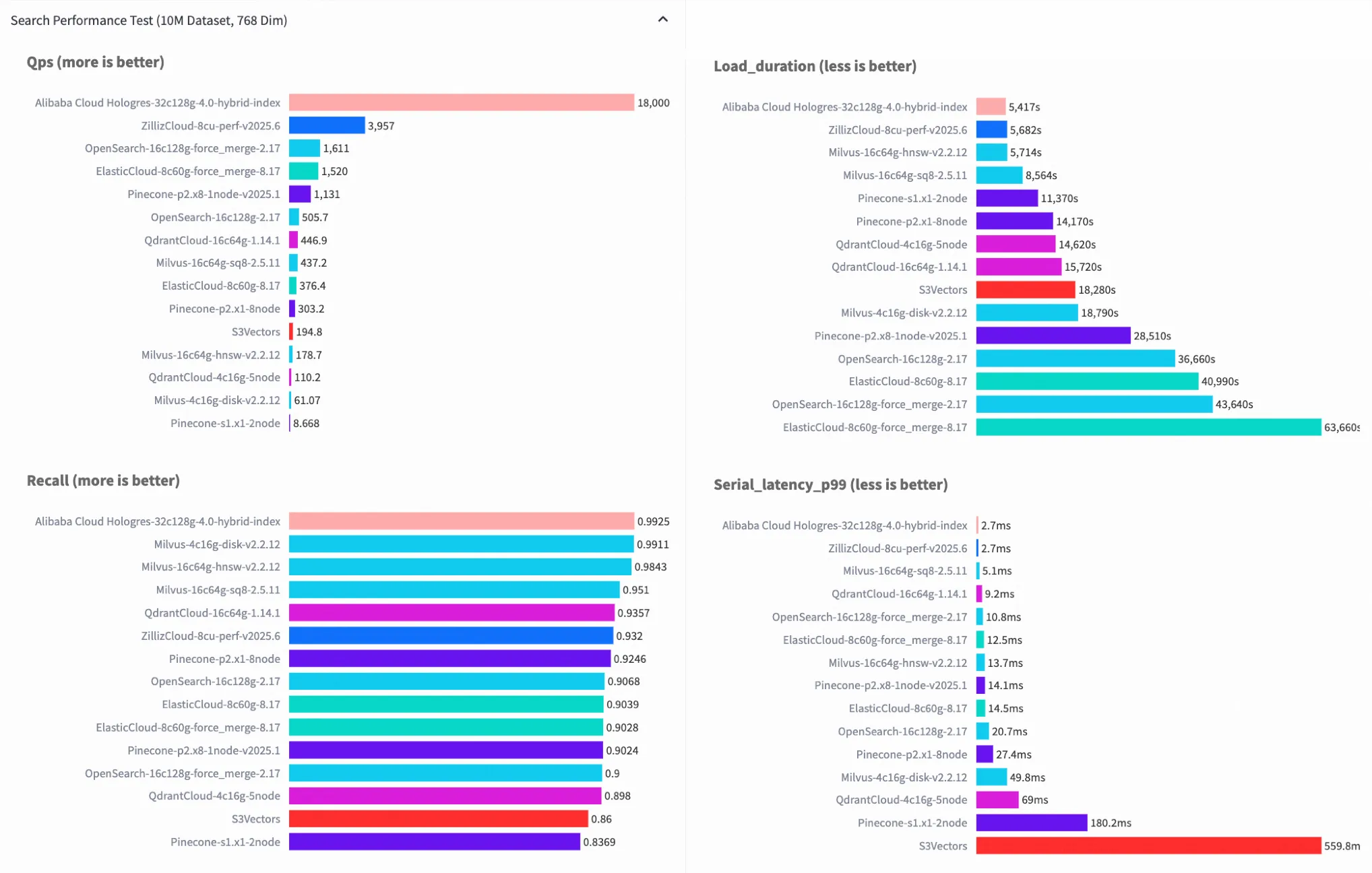 Hologres4.0以“AI时代的一站式多模态分析平台”为核心理念,全面展示了Hologres在结构化、半结构化与非结构化数据分析能力上的重大突破,发布全新向量索引HGraph,登顶 VectorDBBench 性价比榜单QPS、Recall、Latency、Load 四项第一,为AI应用的提供高性价比、高吞吐、低延迟、高并发的向量服务,成为全球最具性价比的向量数据库!