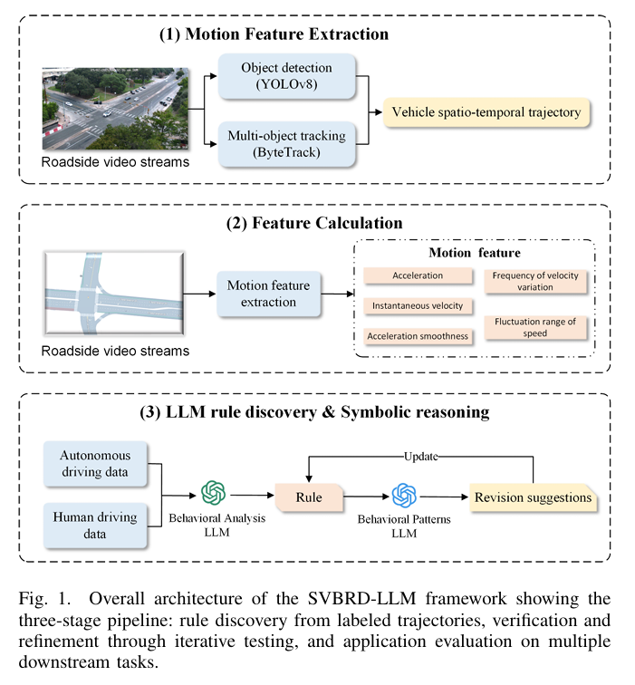 亮点:1. 提出SVBRD-LLM框架,融合计算机视觉与LLM,实现从真实交通视频中自动发现、验证和应用自动驾驶车辆的可解释行为规则;2. 流程完整:通过YOLOv8+ByteTrack提取车辆轨迹,计算运动学特征,再利用GPT-5零样本提示生成35条结构化行为规则假设,经验证集迭代优化过滤虚假关联;3. 应用价值显著:在1500+小时真实交通视频数据集上,自动驾驶车辆识别任务准确率达90.0%,F1-score达93.3%;4. 发现核心行为差异:自动驾驶车辆在速度控制平滑性、车道变更保守性、加速稳定性方面与人类驾驶存在显著区别,规则附带语义描述、适用场景和验证置信度;5. 为交通安全分析、政策制定和公众接受度提升提供数据支撑,推动自动驾驶技术的安全落地。