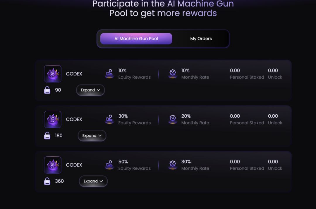 而在近期,CodexField 进一步开放了 AI 机枪池产品,作为基于自研的 Codex AI Engine 运行,通过实时数据分析、自动化策略执行与跨市场调度,为参与者提供可持续的链上收益路径。随着 AI 机枪池的推出,CodexField 的价值循环机制正式进入运营状态,生态增长将从以用户操作驱动的模式,过渡到由 AI 主导的持续增长结构。