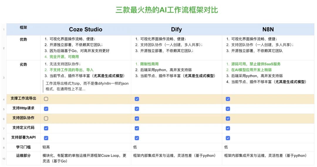 ****测试指令 =****对比一下几款AI工作流框架 Coze、Dify、N8N