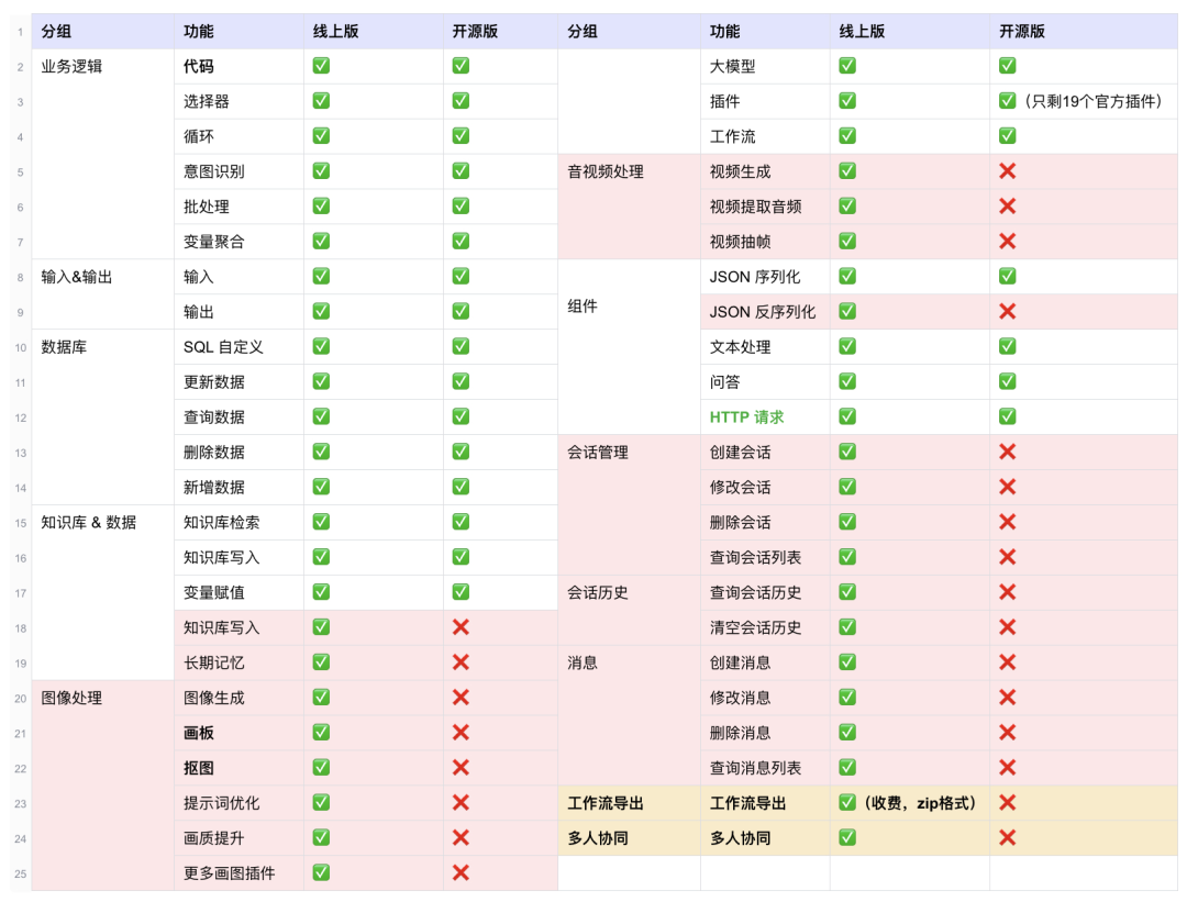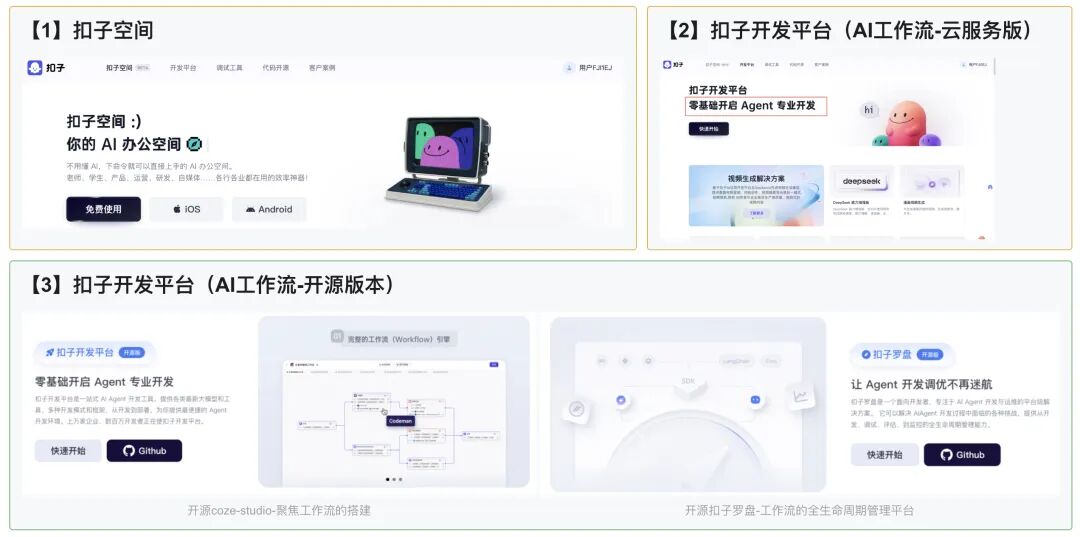 - 扣子(国内版):2024.02,推出国内版本Coze(Web端/移动端)****,****主要面向非开发者提供零代码构建 AI Agent的应用框架,2025.07推出开源版本coze-studio(阉割版)。