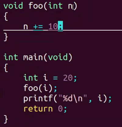 输出i的值为20而并非30。因为在对形参n开辟空间时,用实参i来对n进行初始化,然后对n进行操作,根本不改变i的值,即无法在被调函数里修改主调,而能改变的是指针传参