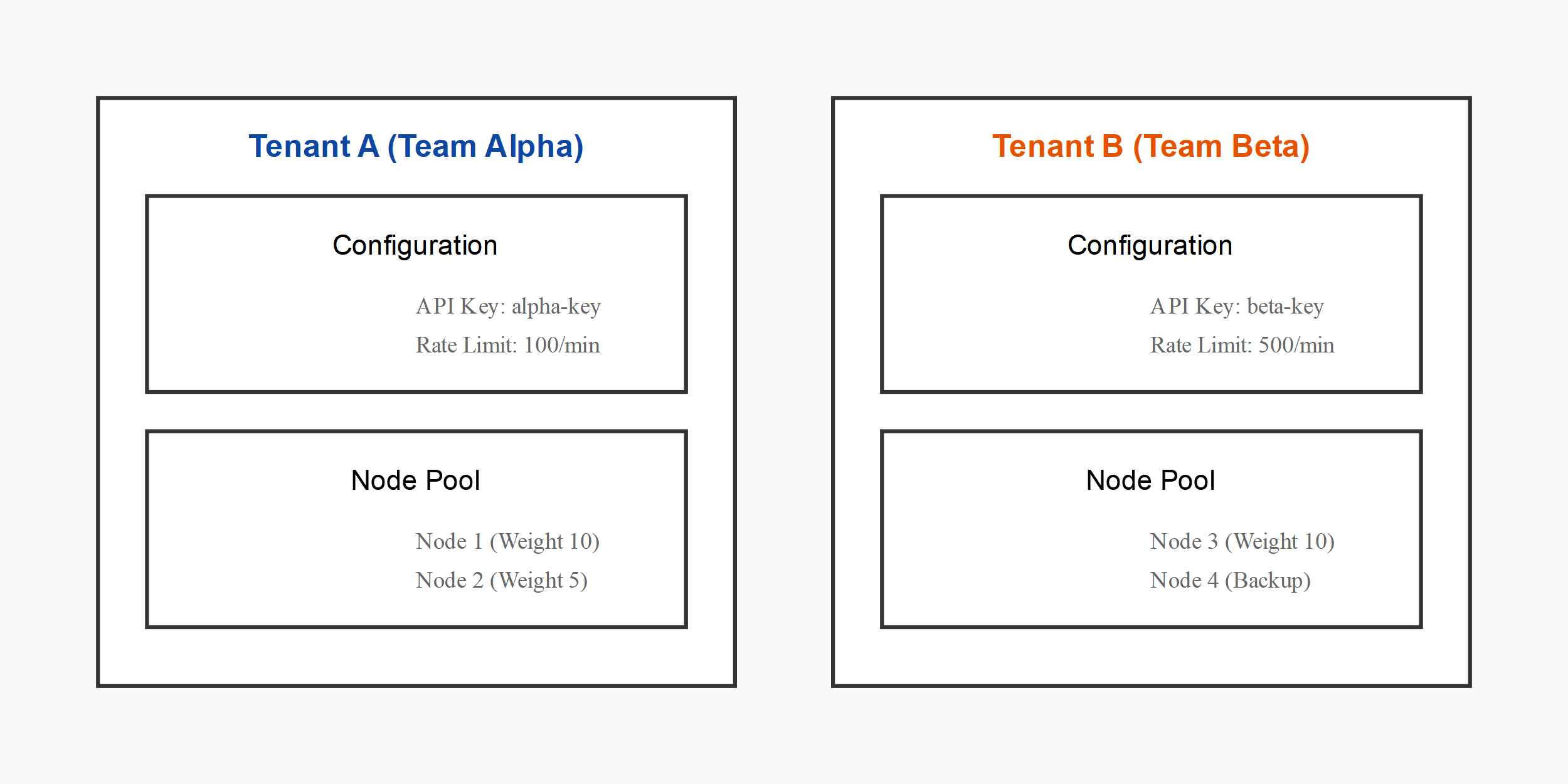 x-api-key,识别你是哪个租户(Team Alpha 还是 Team Beta)。 - 节点选择:在属于你的节点池中,根据权重和健康状态选择最佳节点。