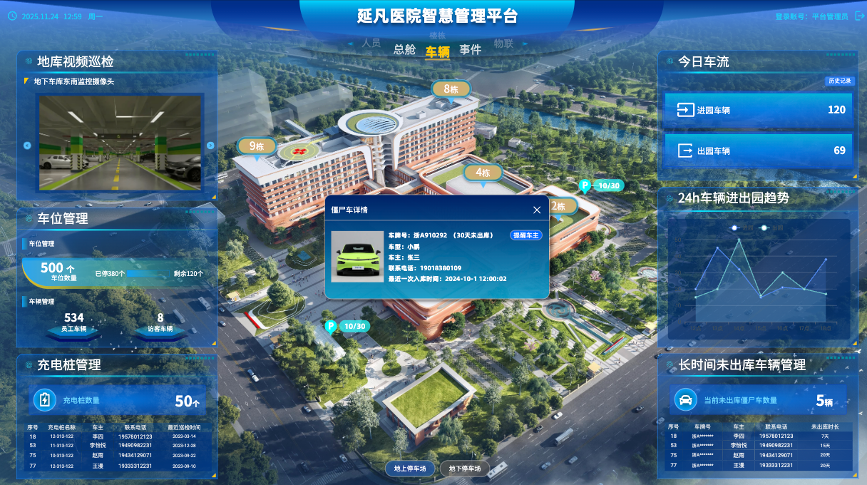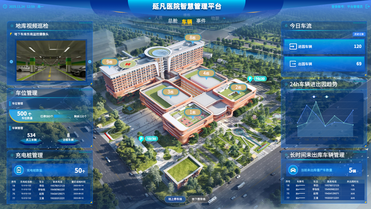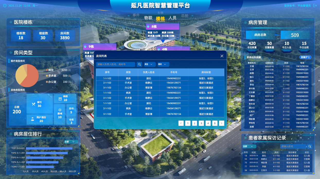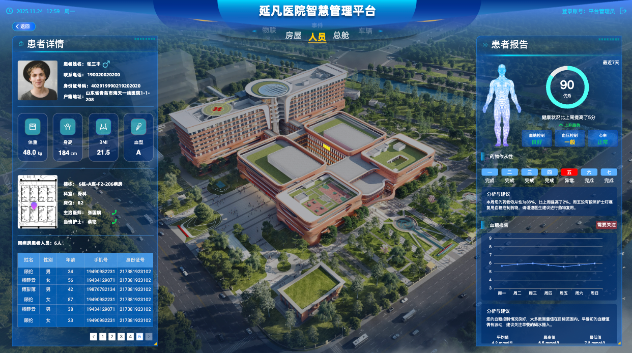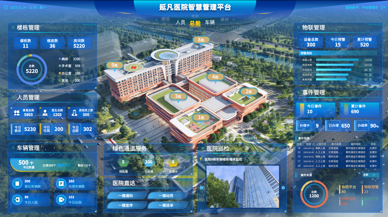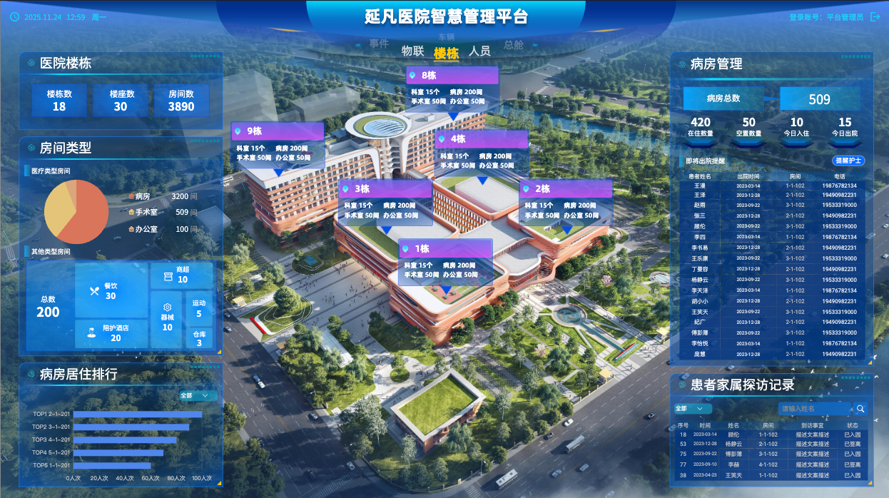- 对医院管理者:提供 “一屏统览全院” 可视化看板,实时掌握门诊流量、床位使用率、设备状态、能耗数据、医保结算进度,决策从 “经验判断” 转向 “数据驱动”;