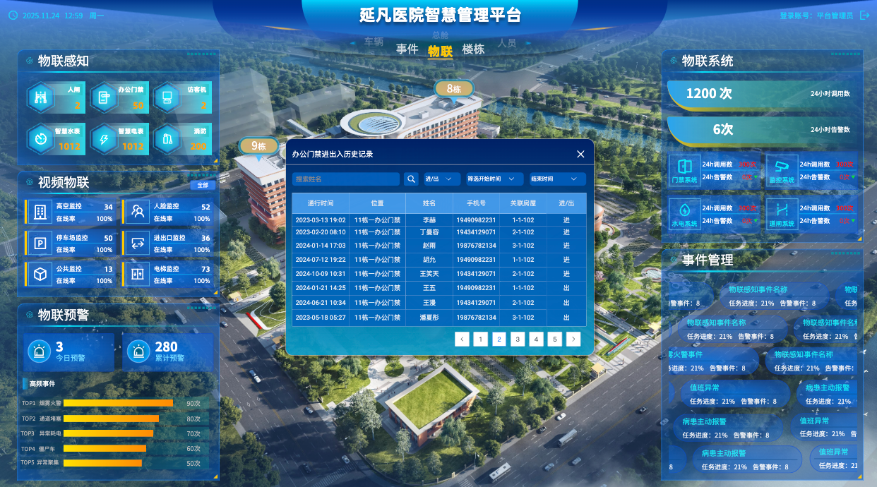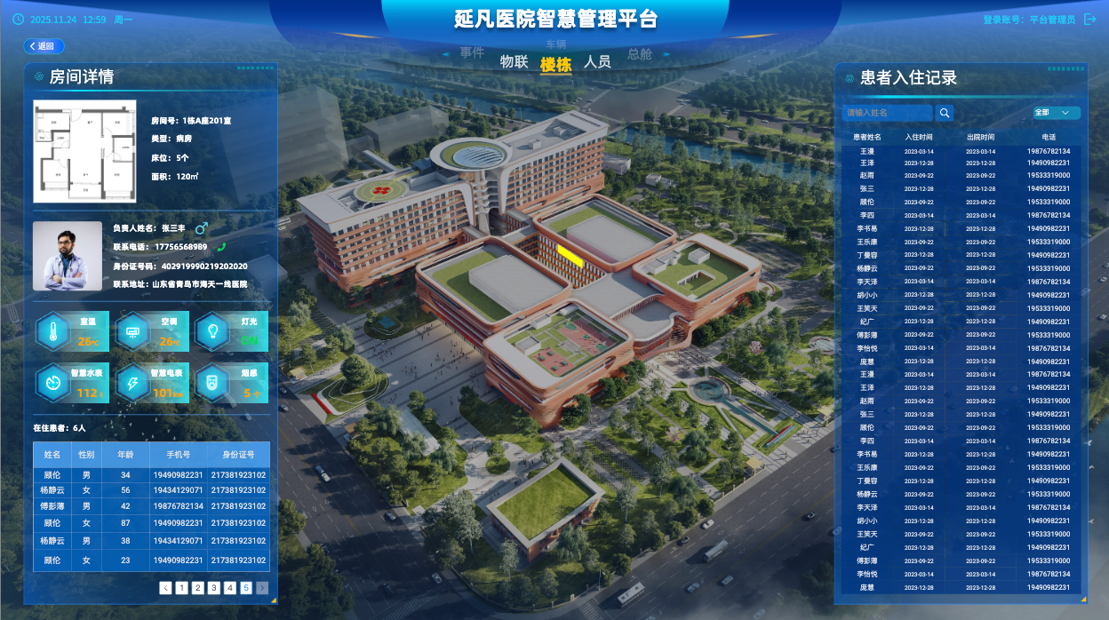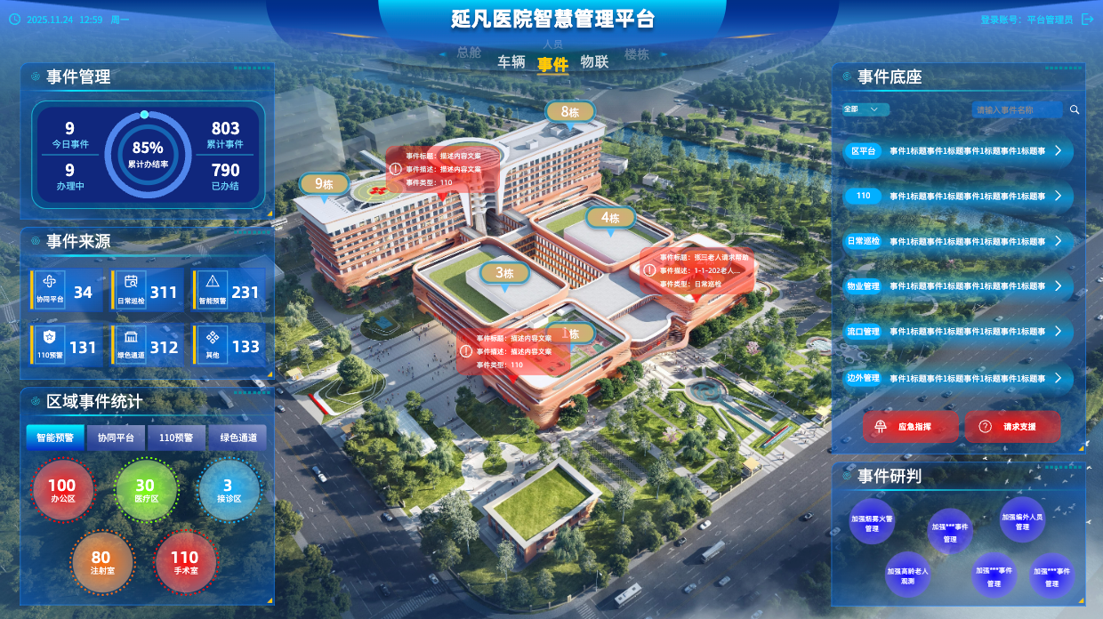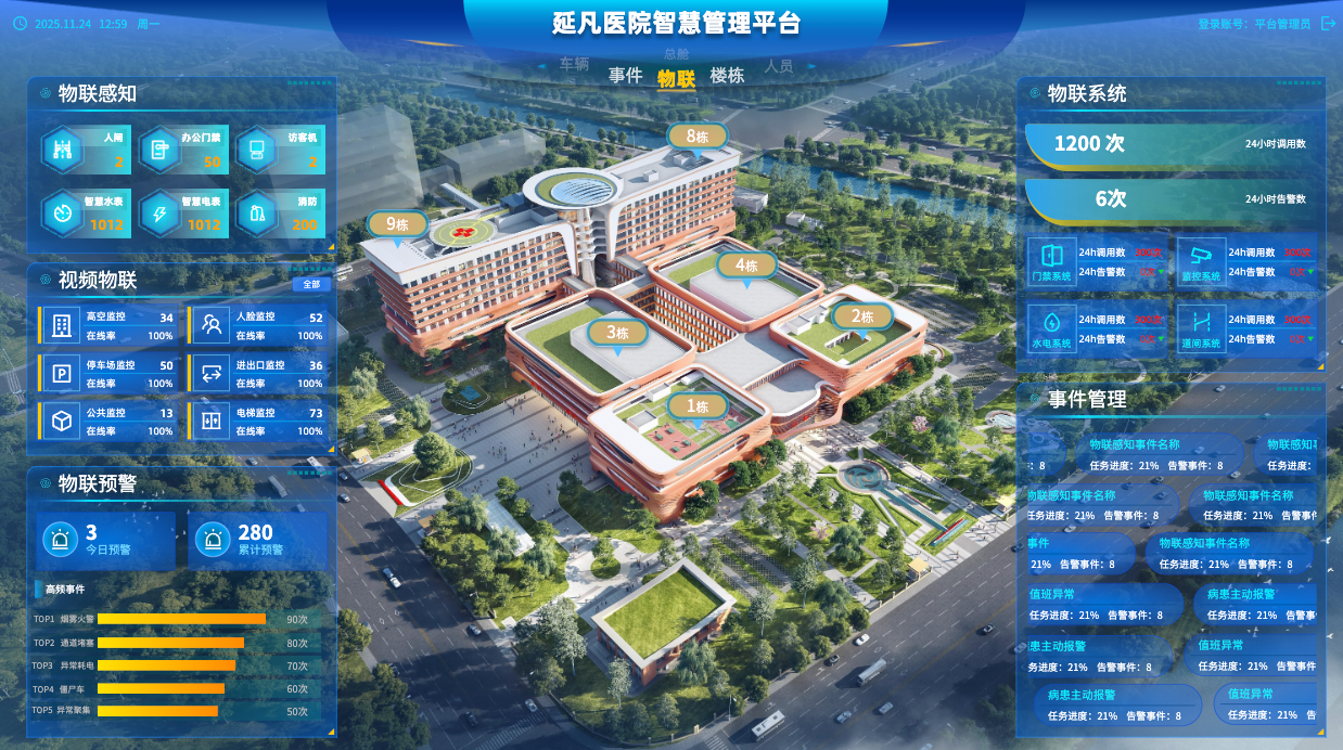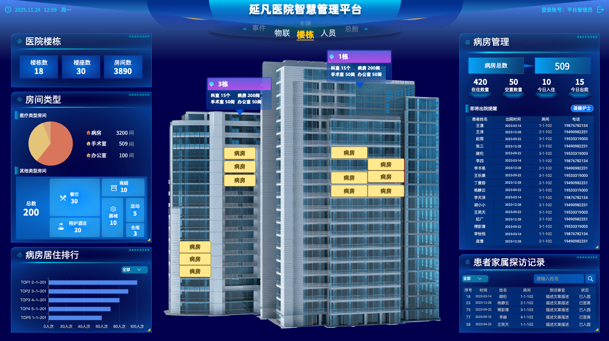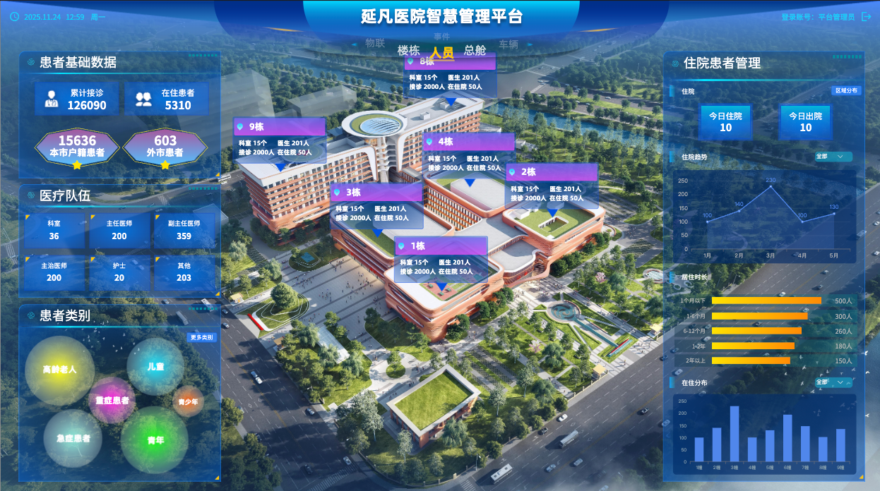 - 可视化管理平台:支持电脑 / 平板 / 手机多端访问,图形化展示门诊、住院、设备、能耗、财务等核心数据;