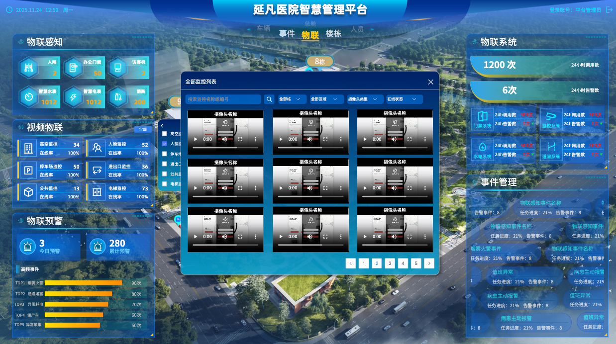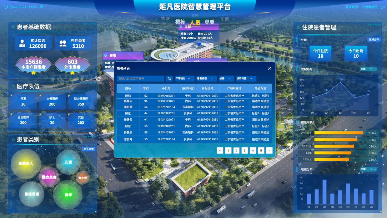 - 全院数据看板:实时展示门诊量、住院量、床位使用率、设备开机率、能耗成本、医保结算率等核心指标,支持多维度筛选;