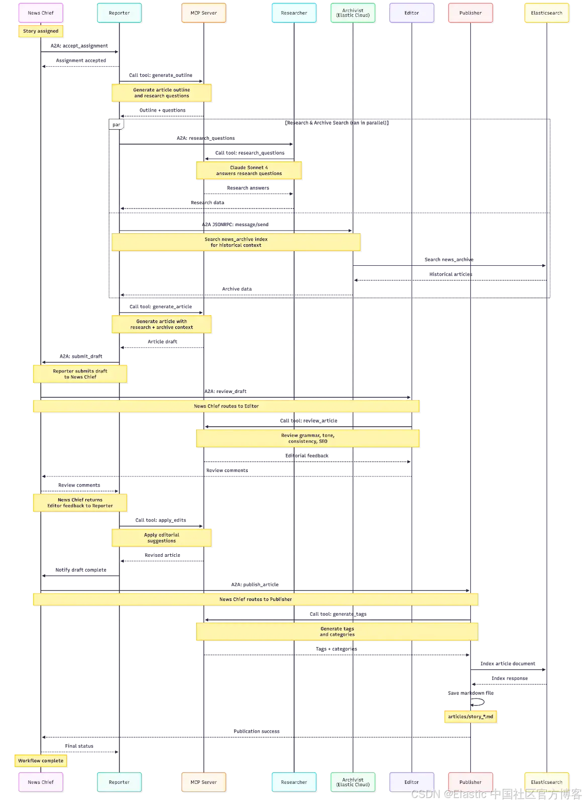 这一步展示了 Elastic 的 A2A agent 是如何融入新闻室工作流的。Archive agent(新闻室的专用 agent)与 Elastic 的 A2A agent(第三方专家)协作,从而利用 Elasticsearch 强大的搜索和分析能力。Elastic 的 agent 在内部使用 MCP 来访问 Elasticsearch 工具,体现了 agent 协作(A2A)与工具访问(MCP)之间清晰的分离。