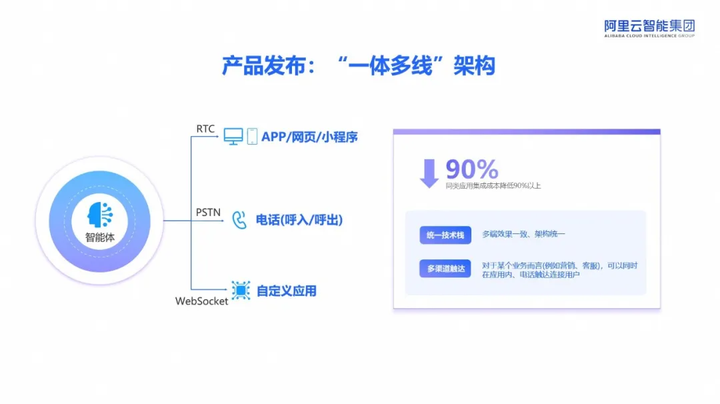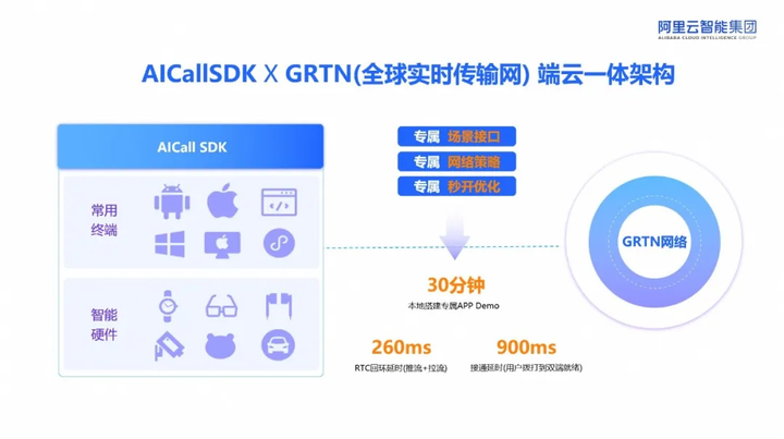 基于阿里云智能的端云一体架构,将面向主流终端及多类智能硬件的 AICall SDK 与全球实时传输网(GRTN)深度结合。为跨终端的低时延、高可用实时通信提供技术保障。