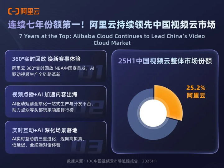 根据IDC最新发布的《2025年上半年中国视频云市场跟踪报告》,阿里云在视频云整体市场份额中以25.2%继续保持市场份额第一。报告指出,2025年上半年中国视频云市场规模达52.3亿美元,按照美元计价同比增长8.9%。