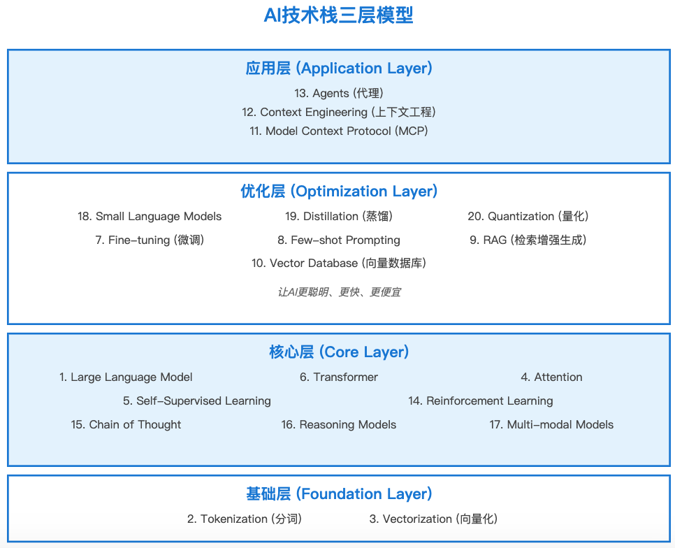 在深入每个概念之前,让我们先建立一个整体框架。这20个概念不是孤立的,而是构成了AI系统的完整技术栈。
