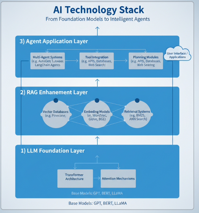 图1:AI技术栈完整架构图 - 从LLM基础到Agent应用的全景视图