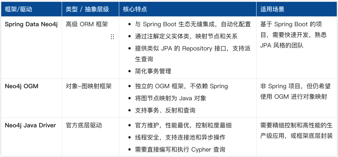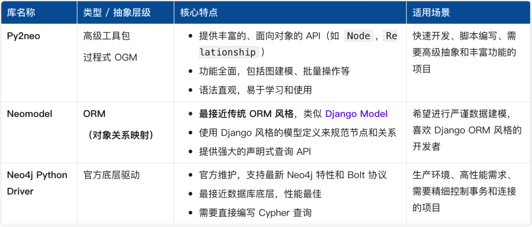 py2neo和neomodel都能提供很好的开发效率。 - 团队熟悉度:团队若熟悉 Spring 生态或 Django ORM,可选择对应的框架以降低学习成本。若对 Cypher 很熟悉,直接使用官方驱动也很高效。