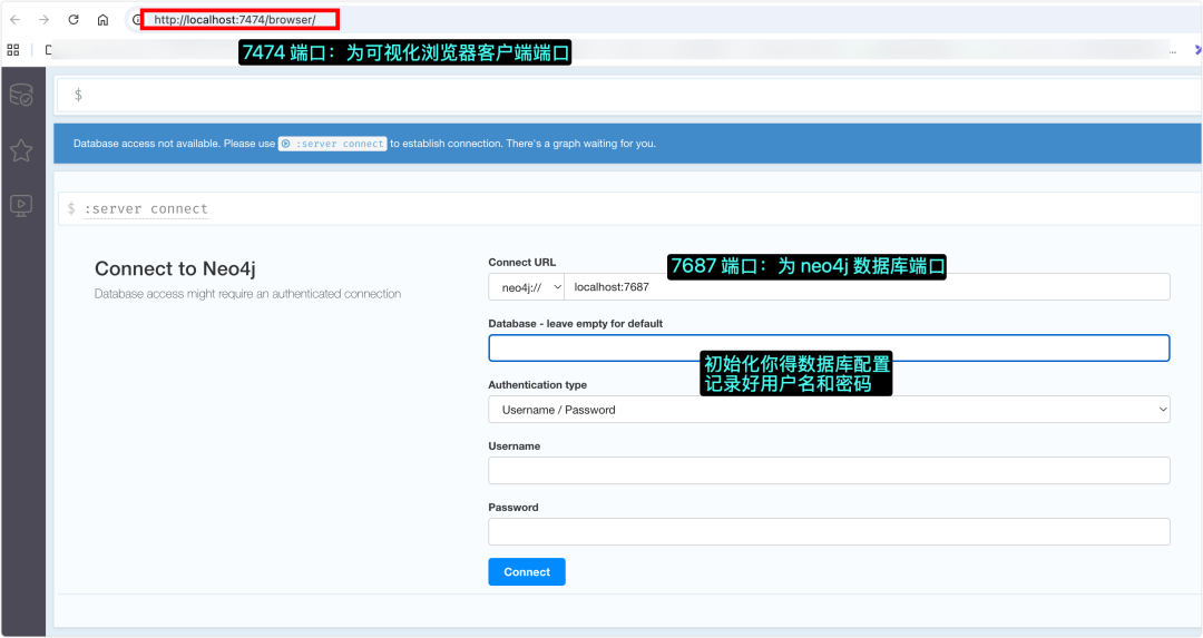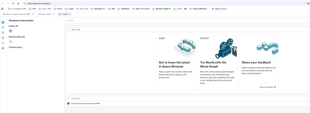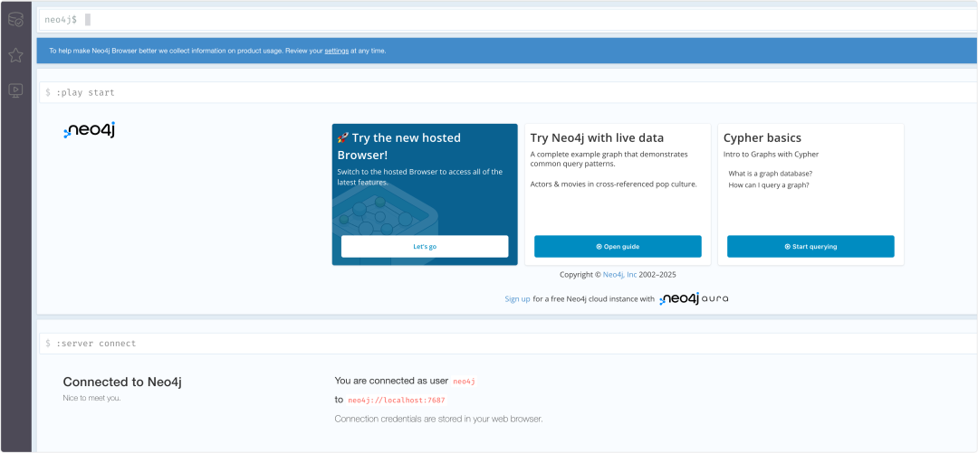 启动成功后,neo4j会提供一个web页面作为客户端,访问地址为http://localhost:7474/browser,初始用户名和密码均为neo4j。初次登录需要修改密码。
