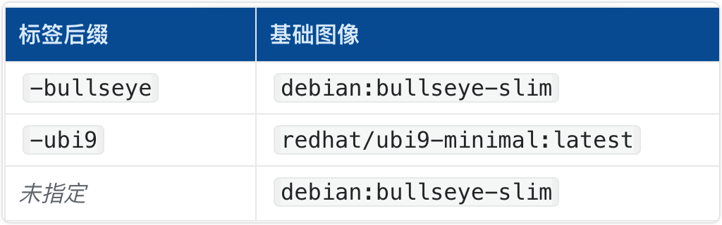 debian:bullseye-slim,也redhat/ubi9-minimal:latest可以作为基础镜像使用。默认值为debian:bullseye-slim。