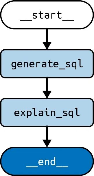 首先,执行该节点,将密钥填充到状态中(该状态将成为最终输出的一部分),并用新消息更新密钥。然后节点运行,将前一步生成的SQL查询输入状态。此时,图运行结束,输出返回给调用者。generate_sqlsql_querymessagesexplain_sqlsql_explanation