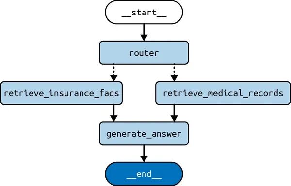 from typing import Annotated, Literal, TypedDictfrom langchain_core.documents import Documentfrom langchain_core.messages import HumanMessage, SystemMessagefrom langchain_core.vectorstores.in_memory import InMemoryVectorStorefrom langchain_openai import ChatOpenAI, OpenAIEmbeddingsfrom langgraph.graph import END, START, StateGraphfrom langgraph.graph.message import add_messagesembeddings = OpenAIEmbeddings()# useful to generate SQL querymodel_low_temp = ChatOpenAI(temperature=0.1)# useful to generate natural language outputsmodel_high_temp = ChatOpenAI(temperature=0.7)class State(TypedDict): # to track conversation history messages: Annotated[list, add_messages] # input user_query: str # output domain: Literal["records", "insurance"] documents: list[Document] answer: strclass Input(TypedDict): user_query: strclass Output(TypedDict): documents: list[Document] answer: str# refer to Chapter 2 on how to fill a vector store with documentsmedical_records_store = InMemoryVectorStore.from_documents([], embeddings)medical_records_retriever = medical_records_store.as_retriever()insurance_faqs_store = InMemoryVectorStore.from_documents([], embeddings)insurance_faqs_retriever = insurance_faqs_store.as_retriever()router_prompt = SystemMessage( """You need to decide which domain to route the user query to. You have two domains to choose from: - records: contains medical records of the patient, such as diagnosis, treatment, and prescriptions. - insurance: contains frequently asked questions about insurance policies, claims, and coverage.Output only the domain name.""")def router_node(state: State) -> State: user_message = HumanMessage(state["user_query"]) messages = [router_prompt, *state["messages"], user_message] res = model_low_temp.invoke(messages) return { "domain": res.content, # update conversation history "messages": [user_message, res], }def pick_retriever( state: State,) -> Literal["retrieve_medical_records", "retrieve_insurance_faqs"]: if state["domain"] == "records": return"retrieve_medical_records" else: return"retrieve_insurance_faqs"def retrieve_medical_records(state: State) -> State: documents = medical_records_retriever.invoke(state["user_query"]) return { "documents": documents, }def retrieve_insurance_faqs(state: State) -> State: documents = insurance_faqs_retriever.invoke(state["user_query"]) return { "documents": documents, }medical_records_prompt = SystemMessage( """You are a helpful medical chatbot who answers questions based on the patient's medical records, such as diagnosis, treatment, and prescriptions.""")insurance_faqs_prompt = SystemMessage( """You are a helpful medical insurance chatbot who answers frequently asked questions about insurance policies, claims, and coverage.""")def generate_answer(state: State) -> State: if state["domain"] == "records": prompt = medical_records_prompt else: prompt = insurance_faqs_prompt messages = [ prompt, *state["messages"], HumanMessage(f"Documents: {state["documents"]}"), ] res = model_high_temp.invoke(messages) return { "answer": res.content, # update conversation history "messages": res, }builder = StateGraph(State, input=Input, output=Output)builder.add_node("router", router_node)builder.add_node("retrieve_medical_records", retrieve_medical_records)builder.add_node("retrieve_insurance_faqs", retrieve_insurance_faqs)builder.add_node("generate_answer", generate_answer)builder.add_edge(START, "router")builder.add_conditional_edges("router", pick_retriever)builder.add_edge("retrieve_medical_records", "generate_answer")builder.add_edge("retrieve_insurance_faqs", "generate_answer")builder.add_edge("generate_answer", END)graph = builder.compile()