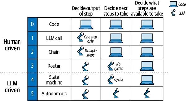描述LLM应用自主性程度的一种方法是评估应用行为中有多少是由LLM决定的(而非代码):