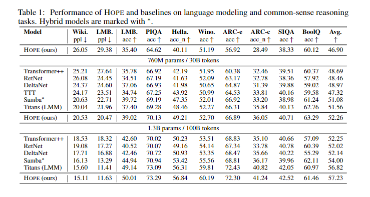 在实验中,HOPE 模型(760M 和 1.3B 参数量)在语言建模和常识推理任务上,击败了同等规模的 Transformer++、RetNet 和 Mamba (Titans) , 更重要的是它展示了更低的困惑度(Perplexity),证明了这种“动态更新”机制的有效性。
