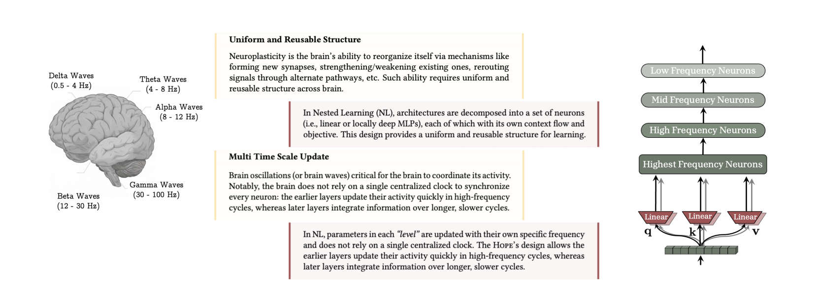 就像人类大脑有不同频率的脑波(Delta波、Theta波、Alpha波等)分别负责不同层级的记忆整合一样 ,模型也应该有不同更新频率的组件。
