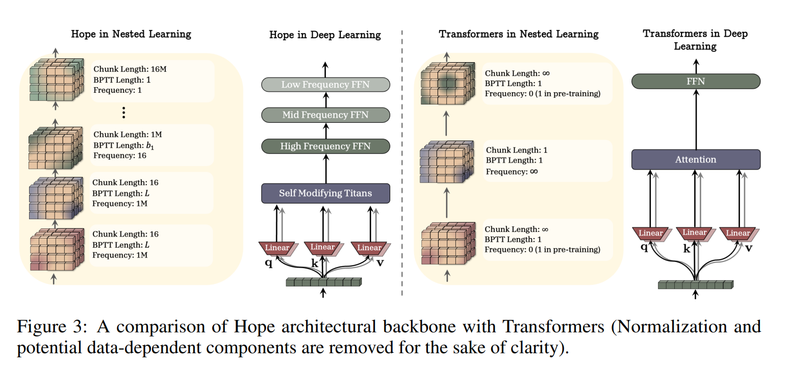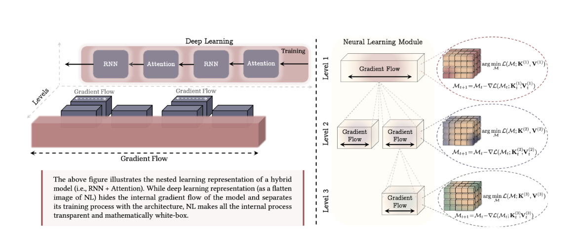 而右图(Neural Learning Module):*是论文的核心视角,它将模型看作一个个嵌套的立方体,每一个立方体代表一个“优化问题” ,从而实现不同 Level 的连续频谱,每一层都有自己的梯度流(Gradient Flow)和更新目标。