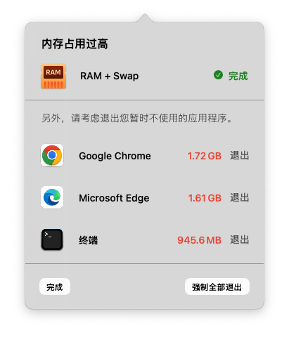 内存泄漏往往表现为单个应用异常飙升,此时最直接的方法是强制退出。
