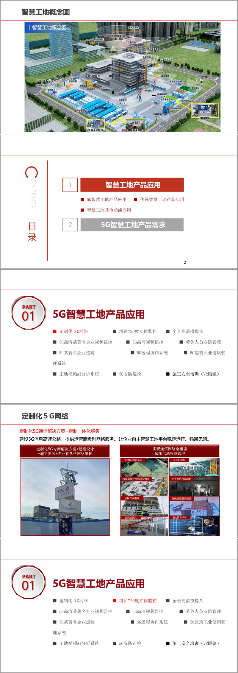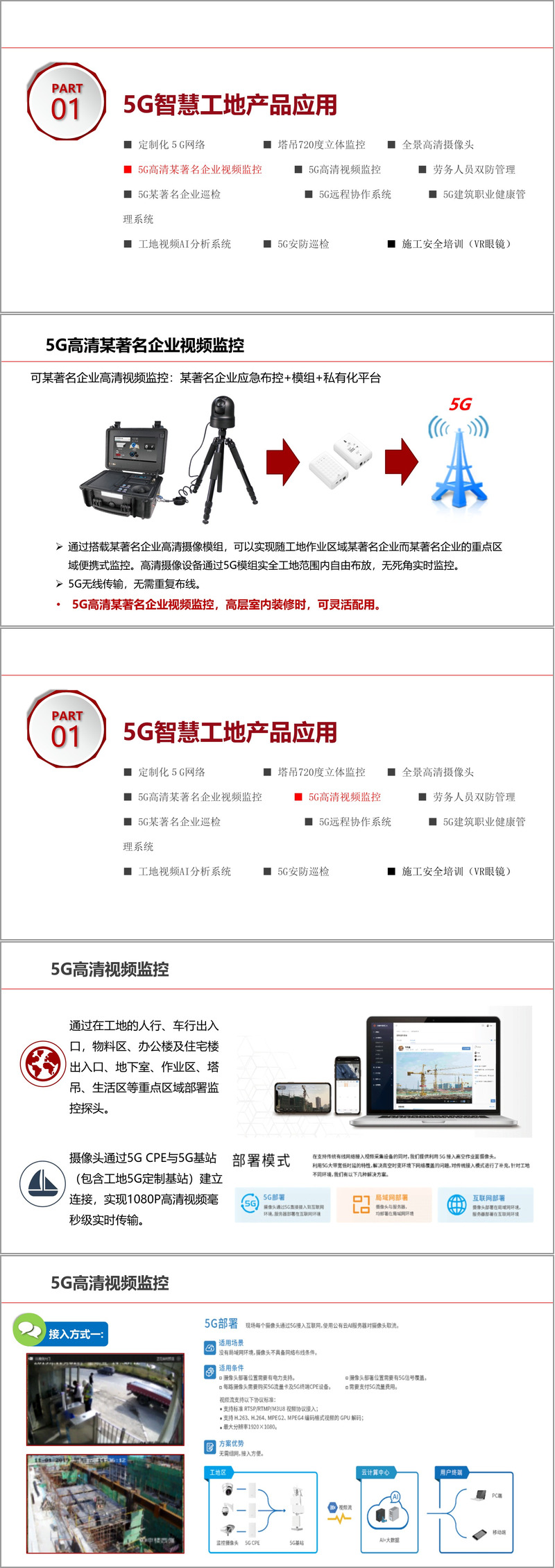 涵盖重大危险源监控、爬架安全监测、深基坑监测、升降机安全监控、配电箱监测、扬尘噪音监测、智能水电监测、工地广播系统、智慧安全帽、自动计量系统、车辆管理、便携式防护、危险气体检测和高支模监测等系统。包括定制化5G网络、塔吊720度立体监控、全景高清摄像头、移动视频监控、劳务人员双防管理、移动巡检、远程协作系统、建筑职业健康管理系统、视频AI分析系统、安防巡检机器人和VR安全培训。包括5G无线企