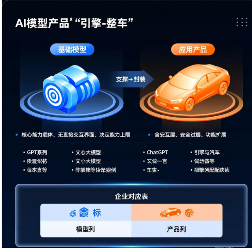 聊 AI 大模型时,很多人都会把 “模型” 和 “产品” 弄混。其实这俩的关系特别好理解:就像汽车的 “引擎” 和 “整车”—— 引擎是核心动力,但光有引擎,普通人没法直接用;得配上车身、方向盘、操作系统,变成一辆完整的汽车,才能开上路。