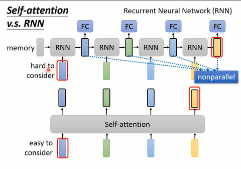 Self-Attention和RNN的结构对比,图源李宏毅的机器学习课程