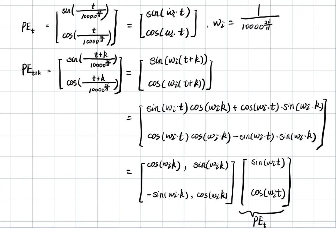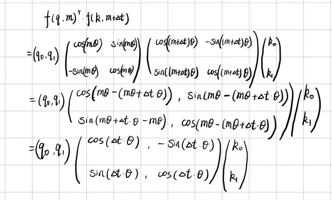 - 位置t和位置t+k的转换是由k决定的,也就是相同的相对距离可以通过相同的线性变换得到。我们假设位置向量只有2维,手推一下公式如下(忽略我的丑字:):