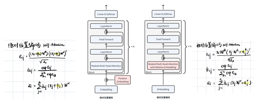 绝对位置编码和相对位置编码的对比,黄色高亮为attention中位置向量的计算区别