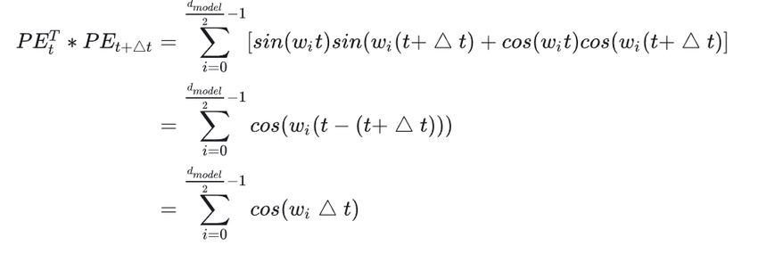 - 在Self-Attention中,不同位置的元素是通过内积计算相关性的,Sinusoidal位置编码的两个位置之间的内积是由相对距离决定的。具体推导在上述博客中有展开,这里直接贴过来: