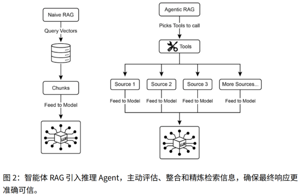 智能体 RAG 则会分析文档元数据,识别 2025 文件为最新、权威来源,丢弃旧信息,只保留正确内容供 LLM 生成。