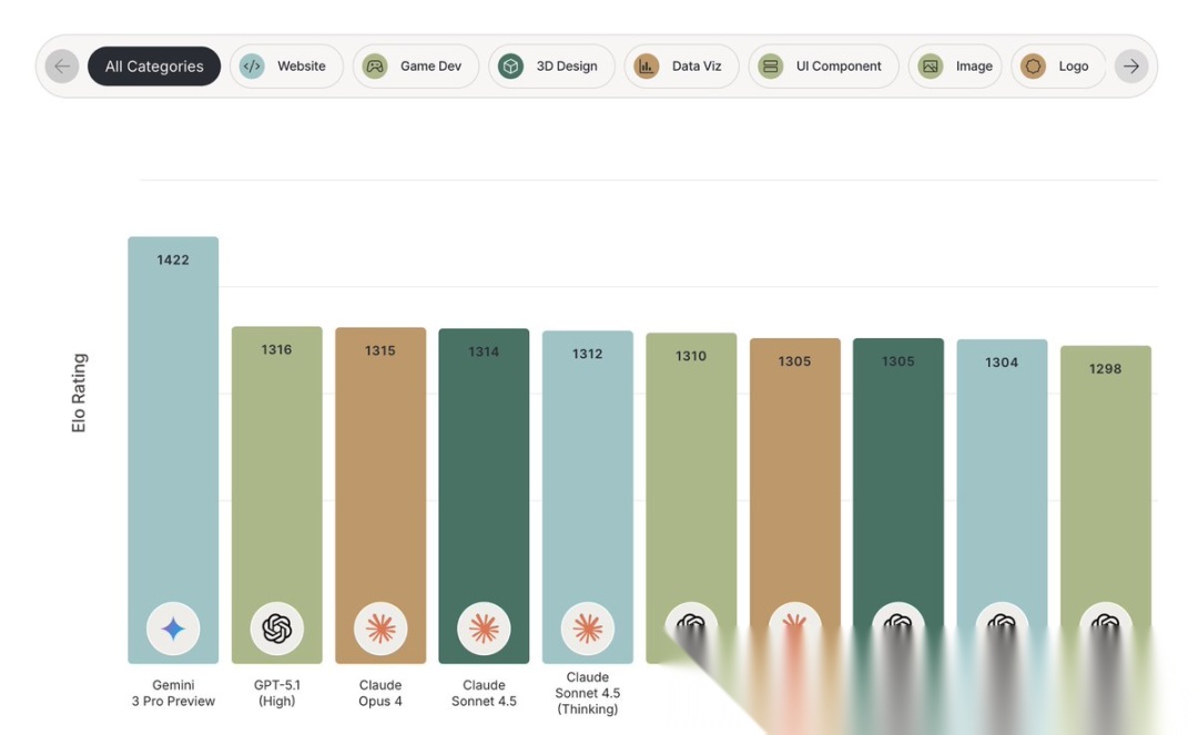比如,在由开发者社区运营的实战编码竞技场Design Arena中,Gemini 3 Pro在整体排名中位列第一,并在五个代码赛区中的四个,网站、游戏开发、3D设计和UI组件中都占据榜首。这是自推出Design Arena以来最大的性能差异。