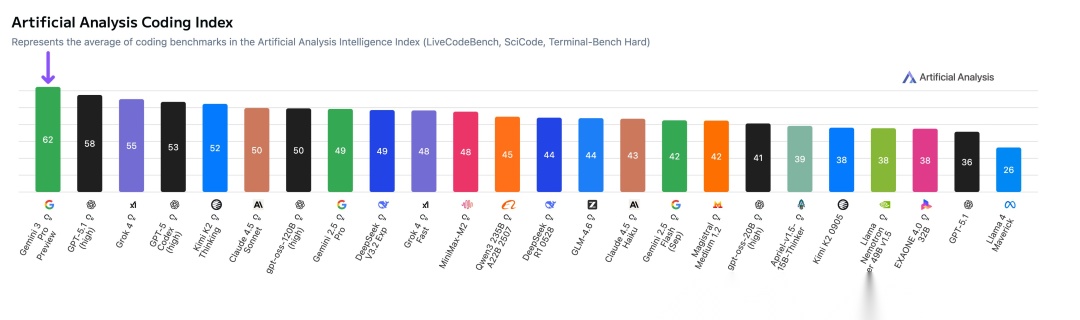 Artificial Analysis的最终排名没有任何悬念:Gemini 3 Pro 以显著优势位居第一,比GPT-5.1高出3分。