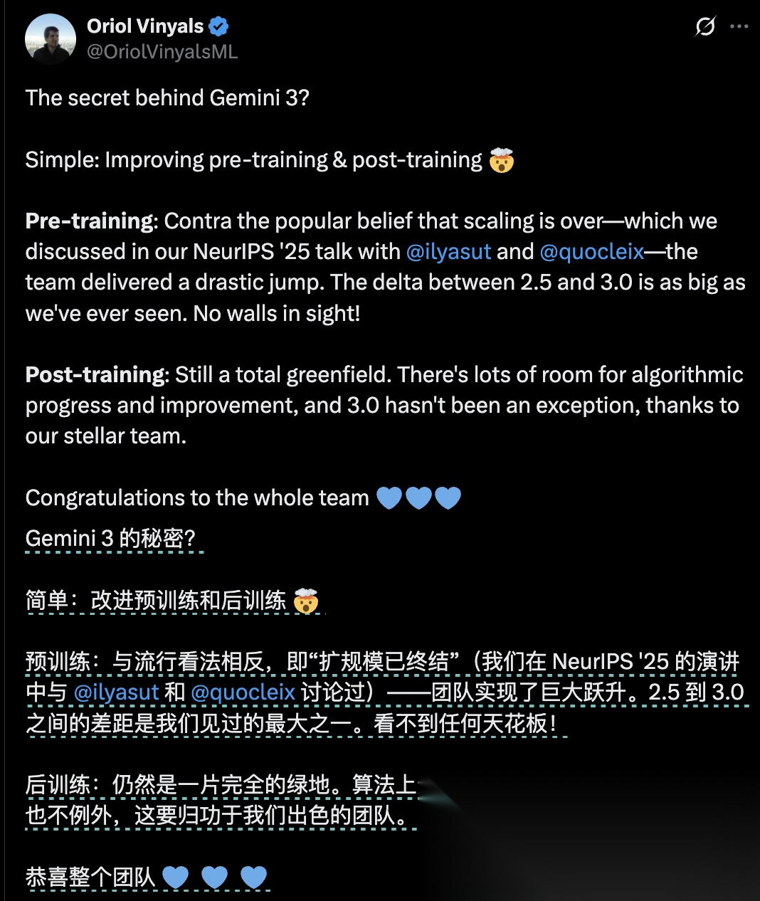 Oriol Vinyals,Google DeepMind的VP of Research、Deep Learning Lead和Gemini项目的联合负责人,在Gemini 3发布后发推文说:“Gemini 3的秘密?简单:改进预训练和后训练。后训练仍然是一片完全的绿地。算法上还有大量进步和改进的空间”。他特别强调:“与流行看法相反,即‘扩规模已终结’——团队实现了巨大跃升。2.5到3.0之间的差距是我们见过的最大之一。看不到任何天花板!”